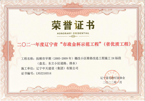 企業(yè)先后榮獲“全國優(yōu)秀施工企業(yè)”、 “中國AAA級信用企業(yè)”、“全國保障性安居工程建設(shè)勞動競賽先進單位”、“遼寧省最受尊敬企業(yè)”、“遼寧省優(yōu)秀建筑業(yè)企業(yè)”、“遼寧省工程建設(shè)質(zhì)量管理優(yōu)秀企業(yè)”、 “遼寧省守合同、重信用企業(yè)”、遼寧省“AAA級信用企業(yè)”、 “撫順市安全生產(chǎn)先進單位、紅旗單位”、“撫順市安康杯競賽先進集體”等多項殊榮。